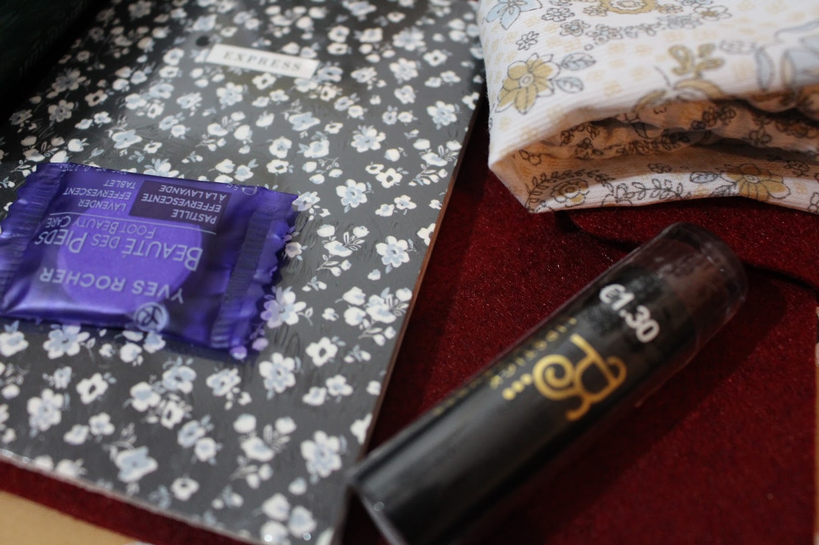 Uma pastilha efervescente para os pés, um bloquinho de notas e um batom bordeaux;